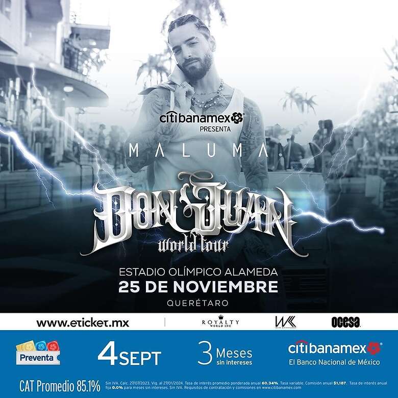 Maluma se presentará en Querétaro el 25 de noviembre, como parte de su gira "Don Juan World Tour" y los precios para ver el concierto van desde 870 hasta 6 mil 360 pesos