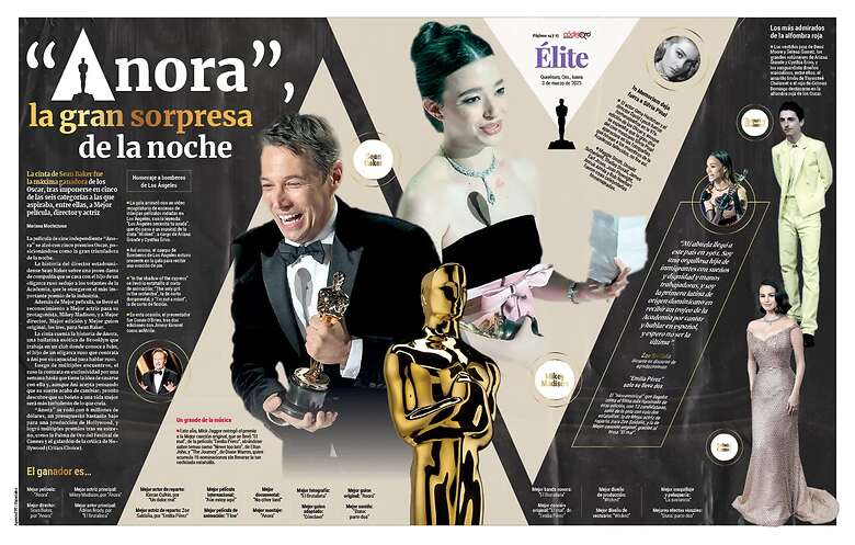 La película de cine independiente “Anora” se alzó con cinco premios Óscar, posicionándose como la gran triunfadora de la noche.