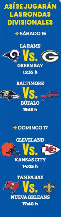 Los enfrentamientos iniciarán el sábado, con los Rams en Green Bay y Baltimore en Búfalo; en tanto que el domingo, Cleveland visitará la casa de los Jefes, que registraron la mejor marca de la temporada, con 14-2; finalmente, los Bucaneros de Tom Brady se enfrentarán a los Santos por un boleto a las finales de Conferencia.