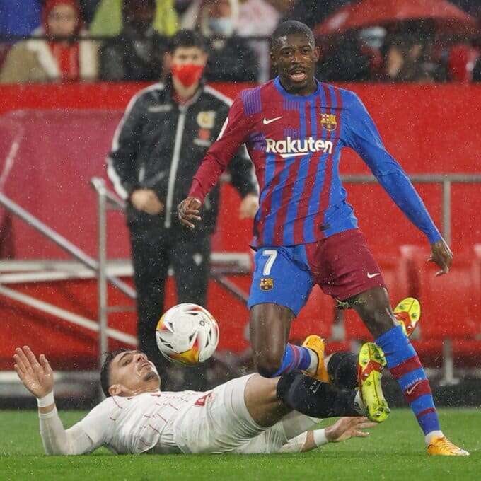 el Sevilla, con diez por la roja a Koundé, se defendió bien ante un Barcelona que estrelló un balón en un poste por medio de Dembélé, su hombre más incisivo.