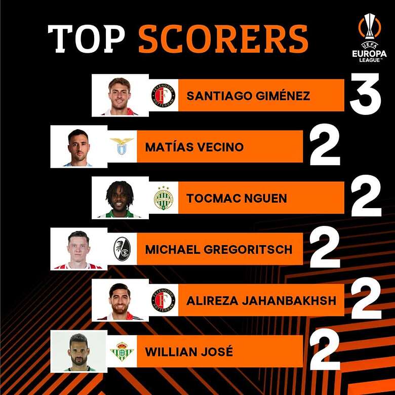 En Europa League, Santiago Giménez suma 53 minutos y tres goles, superando a William José, titular del Betis, quien suma 180 minutos y dos goles; así mismo a Tokman Nguen, de Ferencvaros, con dos tantos en 300 minutos disputados, pues su equipo jugó la fase previa del torneo.