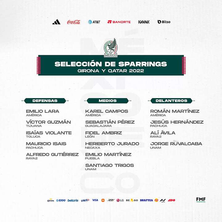 jugadores mexicanos que estarán el Mundial de Qatar 2022. La convocatoria incluye a 31 jugadores que realizarán una gira en Girona, España, 5 futbolistas de esa lista deberán ser dados de baja antes del 14 de noviembre.