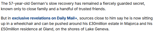 Según reportes basados en una investigación del Daily Mail, el expiloto alemán, ahora con 57 años, ya no está postrado en una cama, como se creía hasta hace poco. Las nuevas descripciones detallan que puede sentarse en una silla de ruedas y ser trasladado con apoyo médico por sus propiedades en Mallorca, España y cerca del Lago Lemán, Suiza, donde su familia mantiene su cuidado.