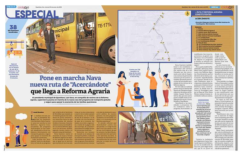 el presidente municipal de Querétaro, Luis Bernardo Nava Guerrero, puso en marcha la ruta Reforma Agraria–Constituyentes, del programa “Acercándote”, el cual -informó- beneficiará a 38 mil ciudadanos directamente, con transporte gratuito y seguro para apoyar la economía de las familias queretanas.