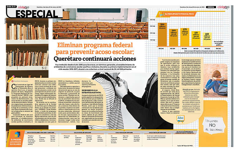 el pasado primero de enero, desapareció el “Programa Nacional de Convivencia Escolar” (PNCE), cuyo propósito era prevenir situaciones de discriminación y de acoso escolar en escuelas públicas de educación básica. Aunque sus asignaciones presupuestales presentaron disminuciones a lo largo de su existencia, no fue sino hasta el presente año cuando la federación lo eliminó del gasto público.