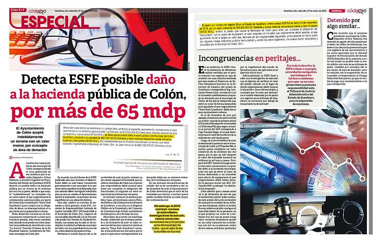 Al auditar las cuentas públicas del municipio de Colón correspondientes al 2019, gobernado en ese momento por el alcalde Alejandro Ochoa Valencia, la Entidad Superior de Fiscalización del Estado de Querétaro