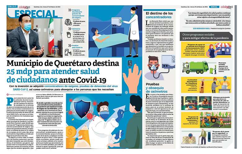 la población durante la pandemia de COVID-19, el municipio de Querétaro ha destinado alrededor de 25 millones de pesos en la implementación de, por lo menos, tres acciones consistentes en el préstamo de concentradores de oxígeno, la aplicación de pruebas de detección del virus SARS-CoV-2, así como en el obsequio de oxímetros a los ciudadanos que lo requieren.