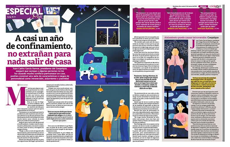 “Para muchas personas estar en casa puede ser muy útil y no mostrar síntomas de depresión o angustia, pero muchas otras pueden pasar por un proceso de depresión y esta depresión tiene muchas características que están ligadas a alteraciones en el sueño, a la conducta alimenticia, la fatiga, el desánimo, el enojo, la irritabilidad y la desesperación; sobre todo cuando el deseo y necesidad de estar fuera de casa es mucho mayor”.
