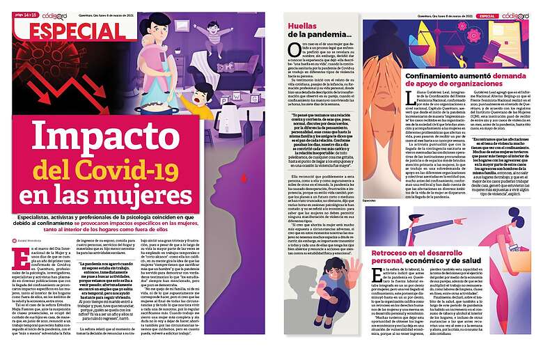 Día Internacional de la Mujer y a unos días de que se cumpla un año del primer caso confirmado de Covid-19 en Querétaro, profesionales de la psicología, investigadores, especialistas y activistas han plasmado en diversas publicaciones que con la llegada del confinamiento se provocaron impactos específicos en las mujeres, tanto al interior de los hogares como fuera de ellos, en los ámbitos de la salud y la economía, entre otros.