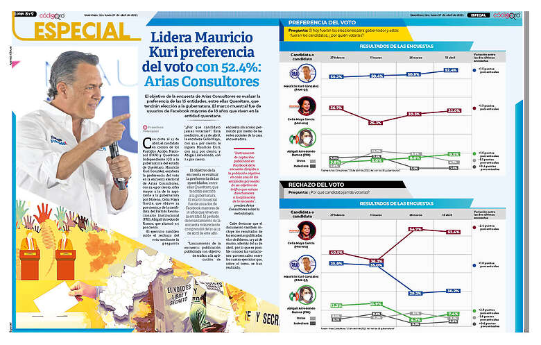 El objetivo de la encuesta de Arias Consultores es evaluar la preferencia de las 15 entidades, entre ellas Querétaro, que tendrán elección a la gubernatura. El marco muestral fue de usuarios de Facebook mayores de 18 años que viven en la entidad queretana
