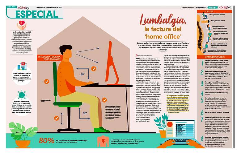 la mayoría de las personas no contaba con un lugar óptimo para trabajar, por lo que improvisaron comedores, dormitorios, salas o cocinas, sin los muebles idóneos, que originaron problemas en la espalda, el cuello, los brazos, las manos, las muñecas, las piernas y los pies, consecuencia de pasar largas horas frente a las computadoras.