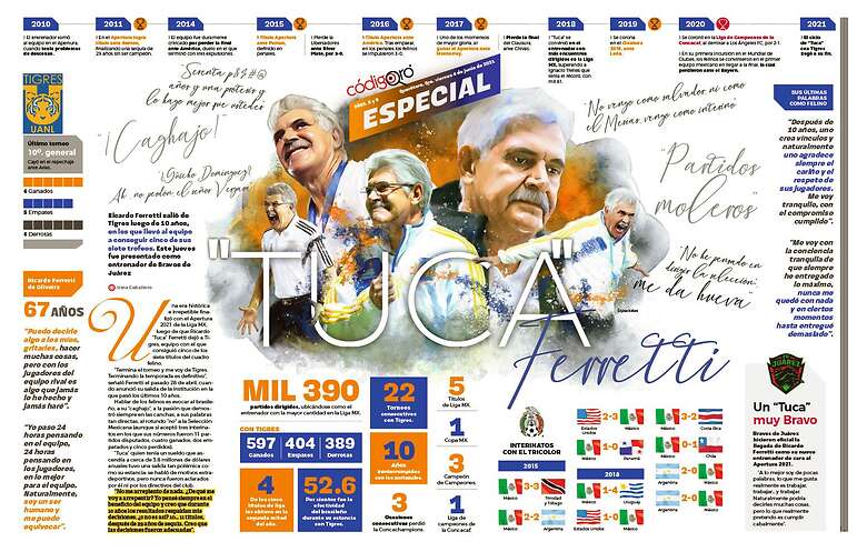 Ricardo "Tuca" Ferretti salió de Tigres luego de 10 años, en los que llevó al equipo a conseguir cinco de sus siete trofeos. Este jueves fue presentado como entrenador de Bravos de Juárez