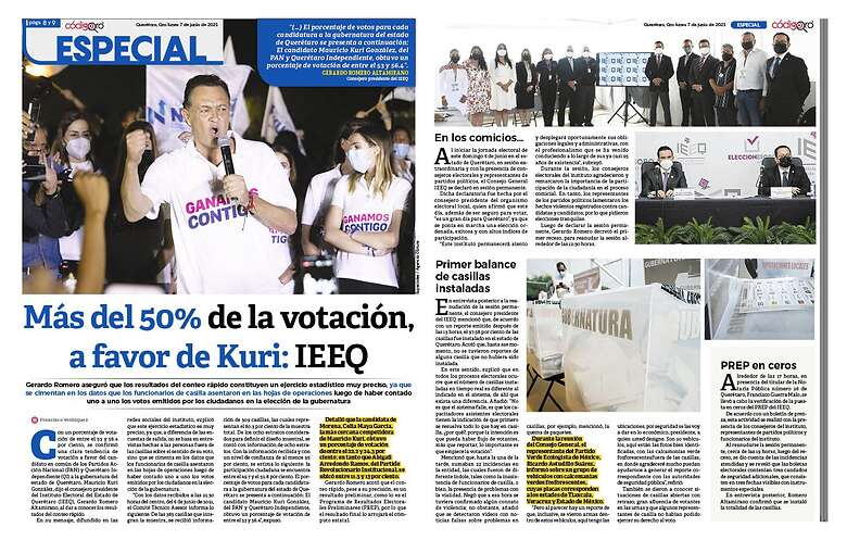 Con un porcentaje de votación de entre el 53 y 56.4 por ciento, se confirmó una clara tendencia de votación a favor del candidato en común de los Partidos Acción Nacional (PAN) y Querétaro Independiente (QI) a la gubernatura del estado de Querétaro,