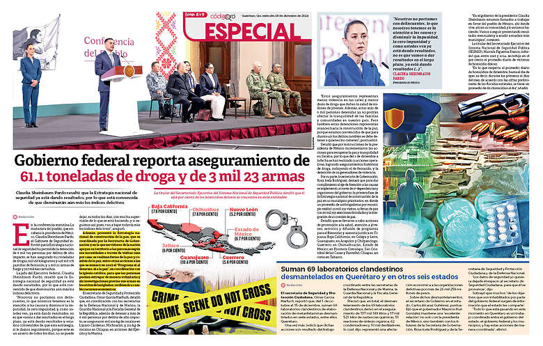 “Estos aseguramientos representan menos violencia en las calles y menos dosis de droga que dañan la salud de millones de jóvenes. Además, estas más de 6 mil personas detenidas ya no podrán afectar la tranquilidad de las familias y comunidades en nuestro país. Pero también estas detenciones representan avances hacia la construcción de la paz, porque estamos convencidos de que para disminuir los delitos también se debe detener a quienes los cometen”, puntualizó.