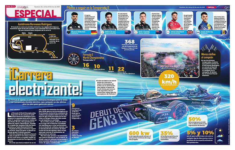 La Fórmula E World Championship llega este fin de semana al autódromo Hermanos Rodríguez para disputar la segunda fecha de la temporada 11. La primera carrera se realizó en Sao Paulo, Brasil, y fue ganada por el piloto de Jaguar, Mitch Evans, seguido en el podio por António Félix Da Costa (Porsche) y Taylor Barnard (Neom).