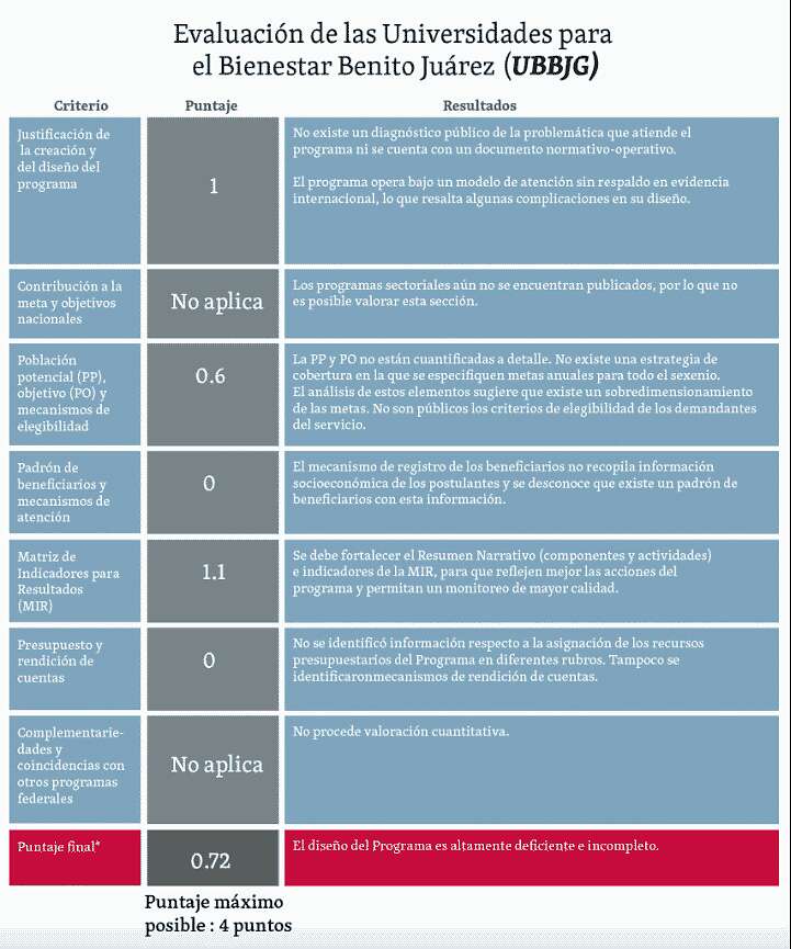 el programa Universidades para el Bienestar está reprobado, ya que solamente alcanzó una calificación de 0.72 de cuatro puntos posibles en una evaluación de la calidad de los servicios educativos, que brindan estos planteles.