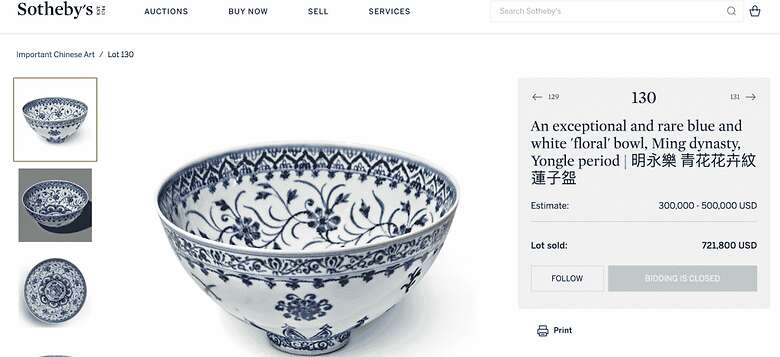 tazón blanco adornado con flores y otros diseños pintados de azul — uno de apenas siete cuya existencia se conozca — estaba entre varias piezas de arte chinas subastadas por