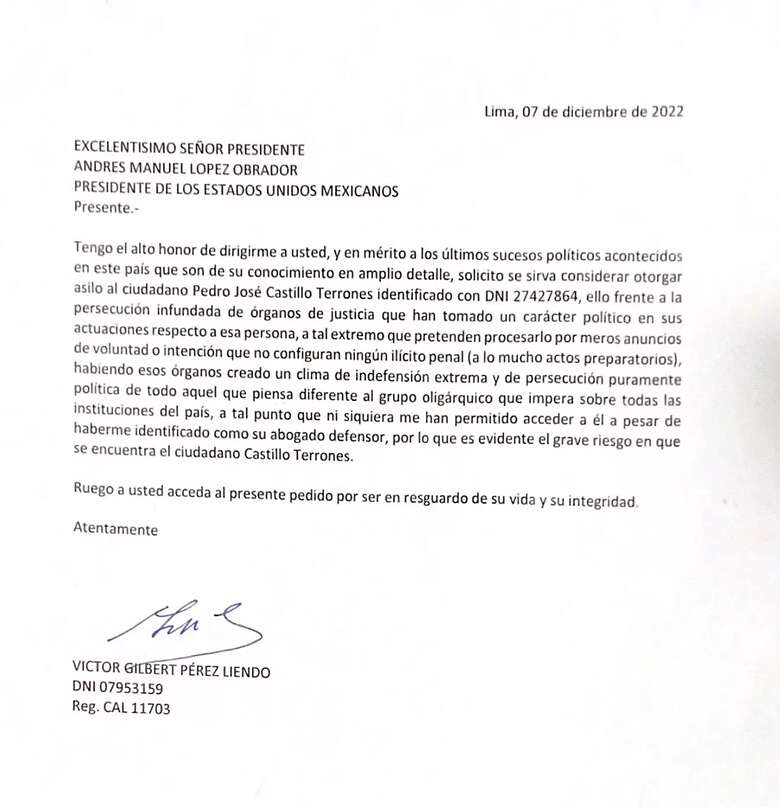 “Solicito se sirva considerar otorgar asilo al ciudadano Pedro José Castillo Terrones, frente a la persecución infundada de órganos de justicia (…) Habiendo creado esos órganos creado un clima de indefensión extrema y de persecución puramente política”, se puede leer en el documento que está dirigido al presidente Andrés Manuel López Obrador.
