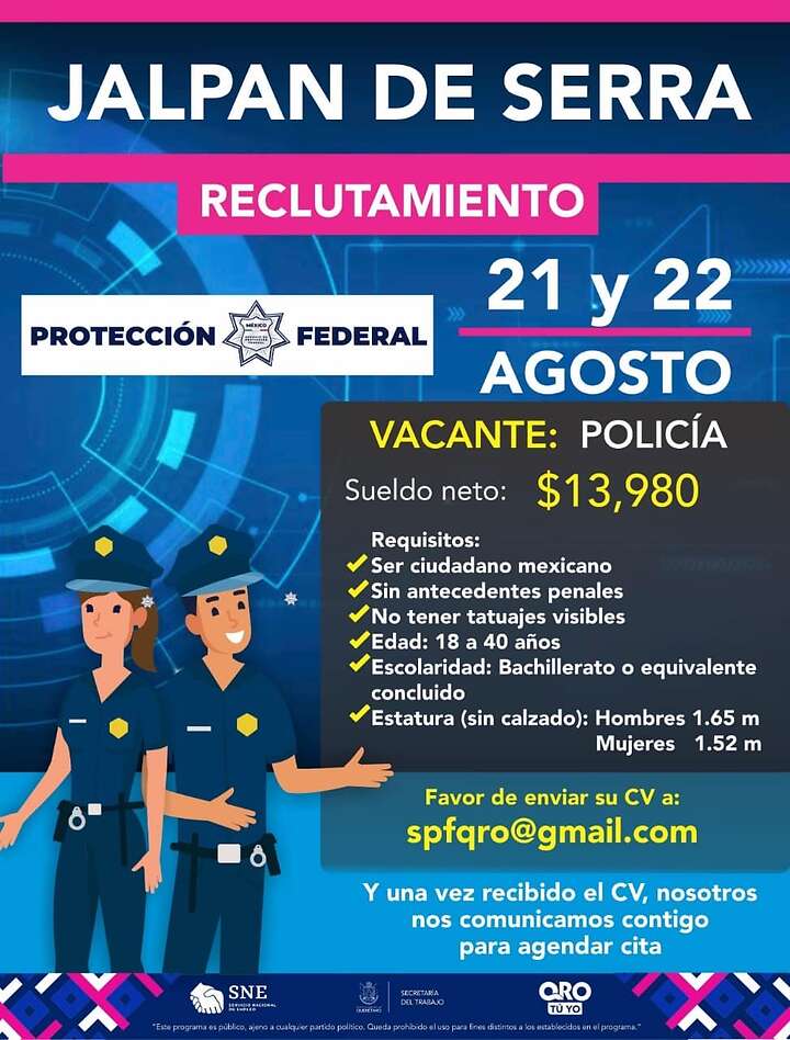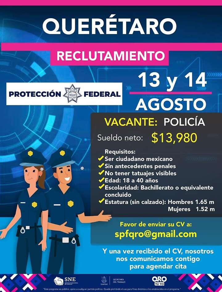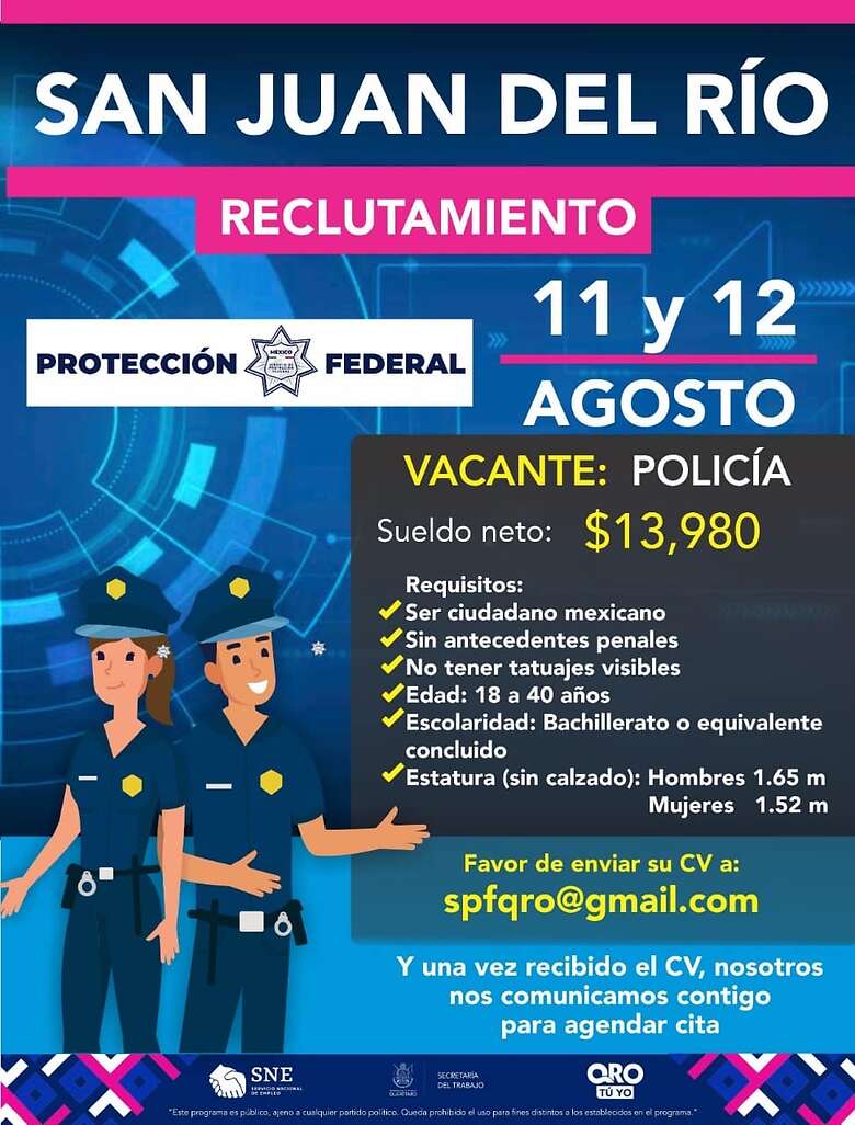 también se llevará a cabo el 11 y 12 de agosto, un reclutamiento para ocupar 400 plazas de Servicio de Protección Personal. Para las y los interesados en la zona metropolitana del estado de Querétaro, este reclutamiento será el 13 y 14 de agosto. Asimismo se realizará el 21 y 22 de agosto.