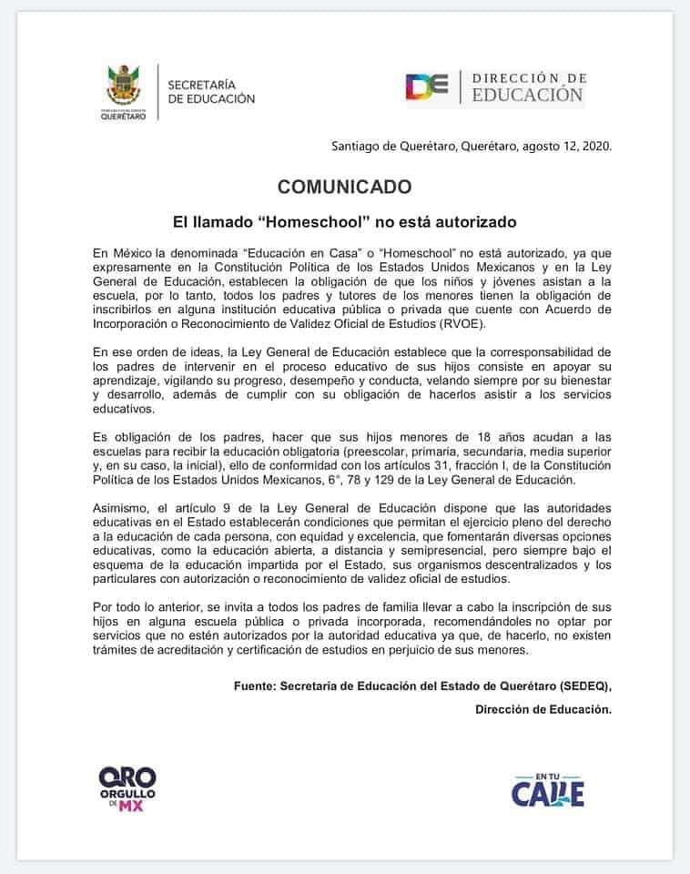 la Secretaría de Educación del Estado de Querétaro advirtió que el denominado fenómeno del ‘Homeschool’ no está autorizado en la entidad federativa y tampoco en el resto del país.