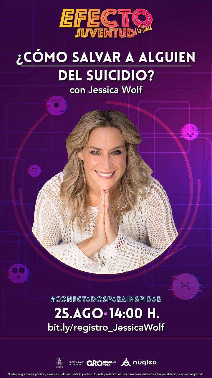 “¿Cómo salvar a alguien del suicidio?” se transmitirá a través de la página de Facebook de la Secretaría de la Juventud del Estado de Querétaro este martes 25 de agosto a las 14:00 horas. Los interesados en participar deben registrarse en el siguiente enlace: bit.ly/registro_JessicaWolf