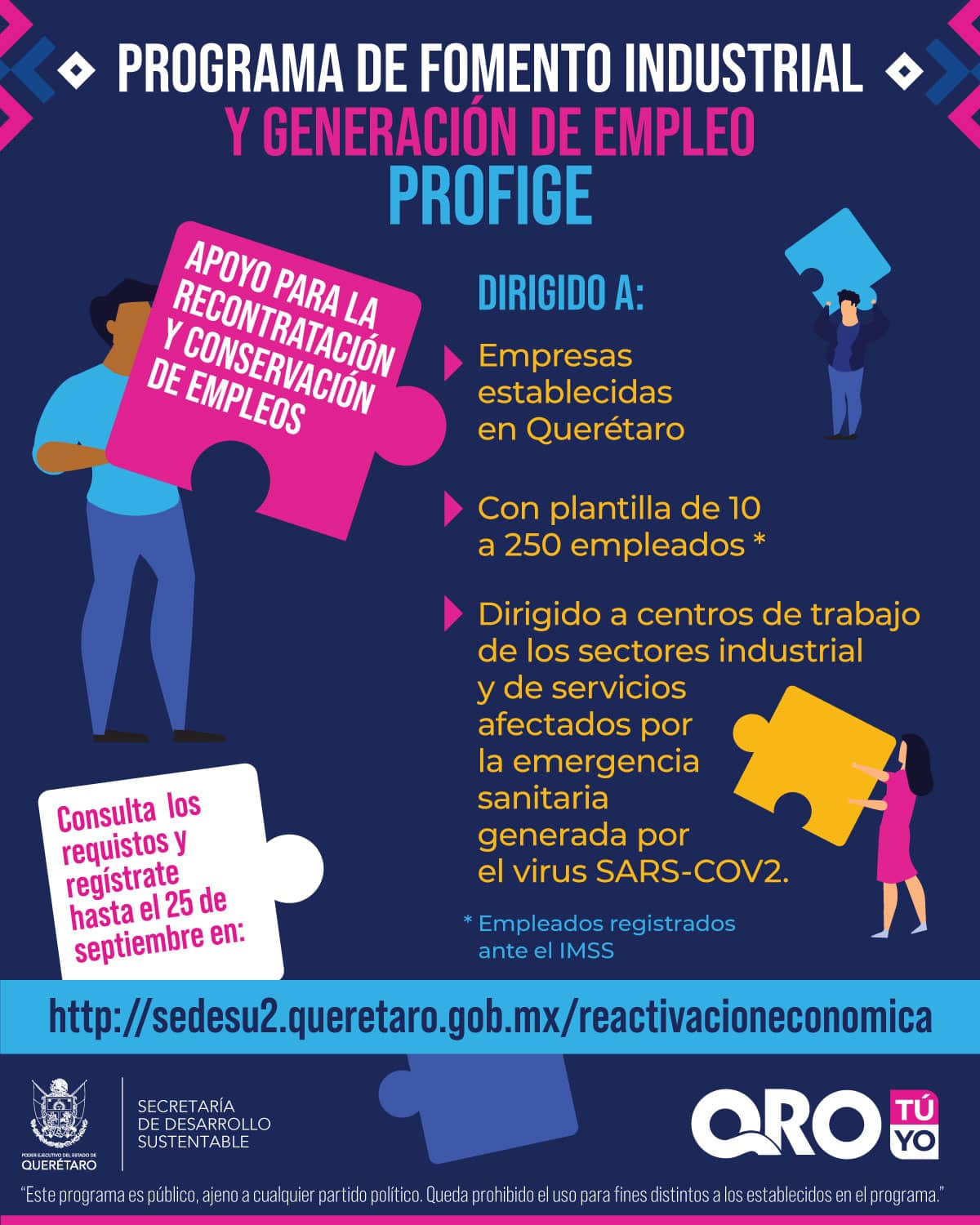 La Secretaría de Desarrollo Sustentable (Sedesu) del Estado de Querétaro otorgará apoyos económicos de hasta 200 mil pesos para que empresas queretanas los utilicen en la recontratación y conservación de empleos. La dependencia estatal invitó a personas físicas y morales con actividad empresarial a participar en la convocatoria 2020 del Programa de Fomento Industrial y Generación de Empleo (PROFIGE), cuyo objetivo es apoyar a centros de trabajo de los sectores industrial, comercio y de servicios afectados por la emergencia sanitaria de COVID-19.