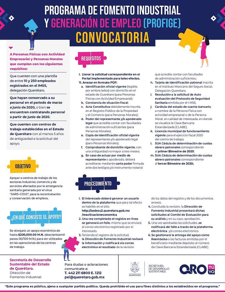 en la convocatoria 2020 del Programa de Fomento Industrial y Generación de Empleo (PROFIGE), cuyo objetivo es apoyar a centros de trabajo de los sectores industrial, comercio y de servicios afectados por la emergencia sanitaria de COVID-19.