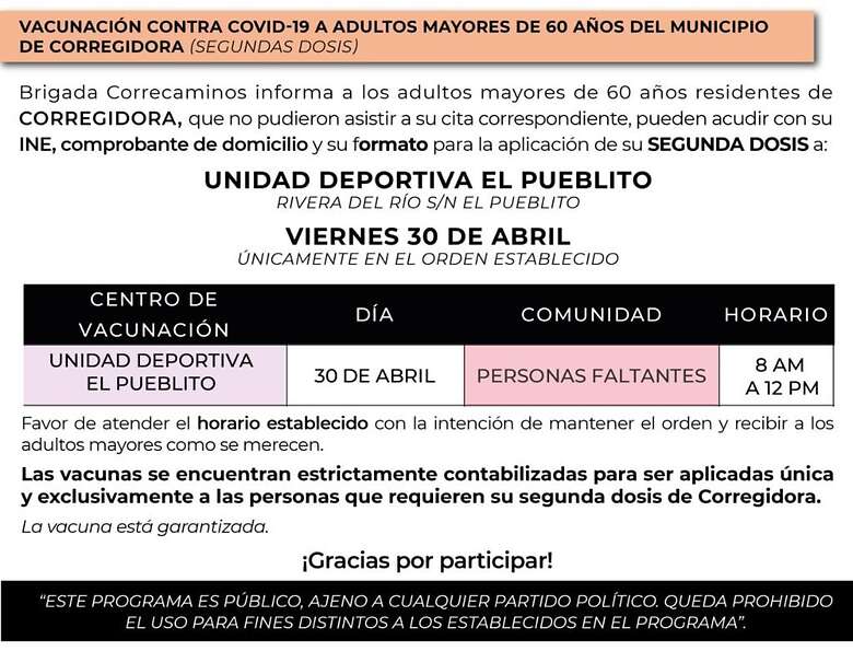 jueves 29 y viernes 30 de abril los adultos mayores de 60 años residentes en Corregidora acudan por su segunda dosis contra Covid-19, a los centros de vacunación instalados en dicho municipio.