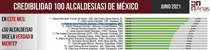 Roberto Sosa Pichardo, presidente municipal de Corregidora, se ubicó en el tercer lugar nacional en materia de aprobación ciudadana con una aceptación de 72.8 por ciento durante junio, de acuerdo con encuesta de Arias Consultores