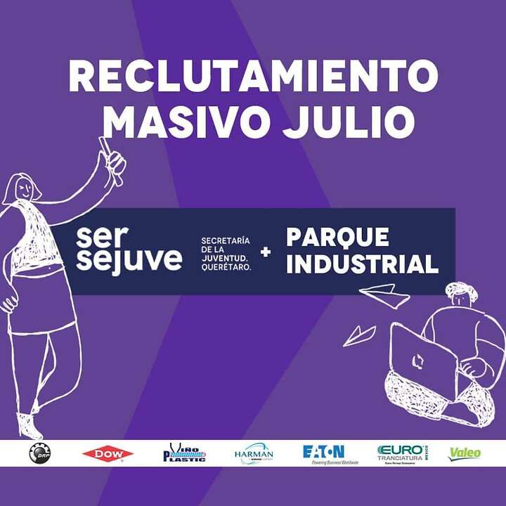 La Secretaría de la Juventud (SEJUVE) informó que este viernes 24 se realizará el reclutamiento masivo de Alsea; el lunes 27 habrá Feria de Empleo virtual; y el viernes 1 de julio reclutamiento masivo en el Parque Industrial Querétaro