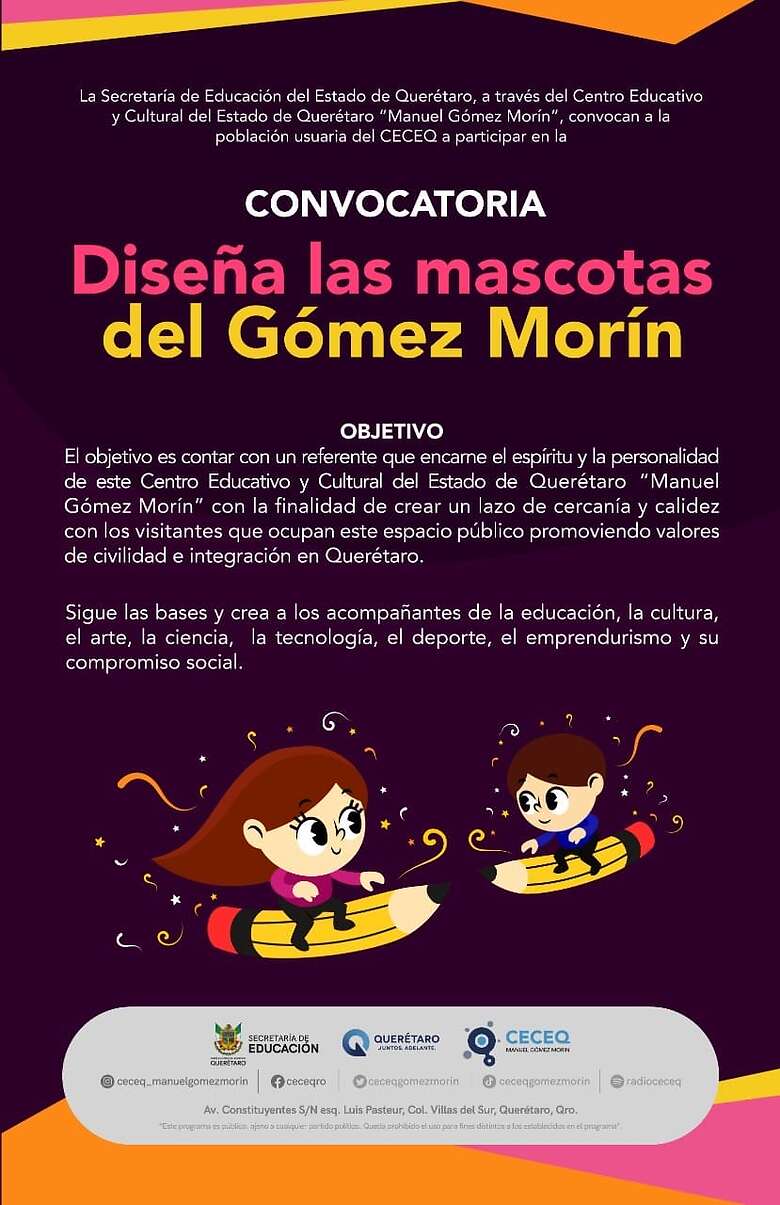 El Centro Educativo y Cultural del Estado de Querétaro (CECEQ) y la Secretaría de Educación abrieron la convocatoria para la iniciativa “Diseña las mascotas del Gómez Morín”; el rango de edad para participar es de 6 a 24 años