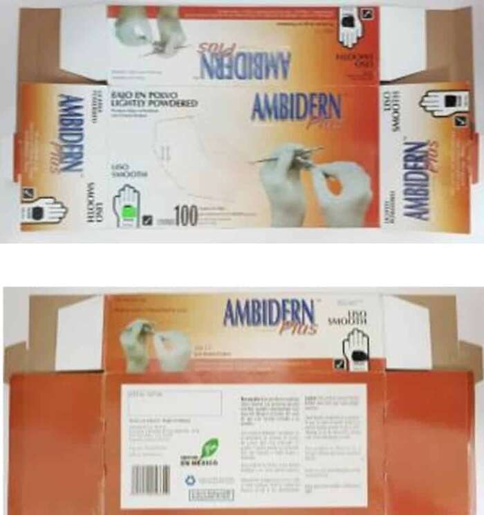 - AmbidernTM Plus Caja marrón con 100 guantes de látex: La denominación AmbidernTM Plus no existe, esta presentación imita a la legalmente registrada, presenta colores obscuros en gama de marrón a naranja y no cuenta con número de lote.