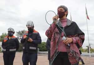 Dra. Teresa García Gasca, encabezó la salida de trabajadores de la Administración Central hacia la Explanada; mientras que, en las demás áreas, la evacuación fue liderada por la respectiva brigada de voluntarios y supervisada por el equipo de la Coordinación de Protección Civil Universitaria (CPCU).