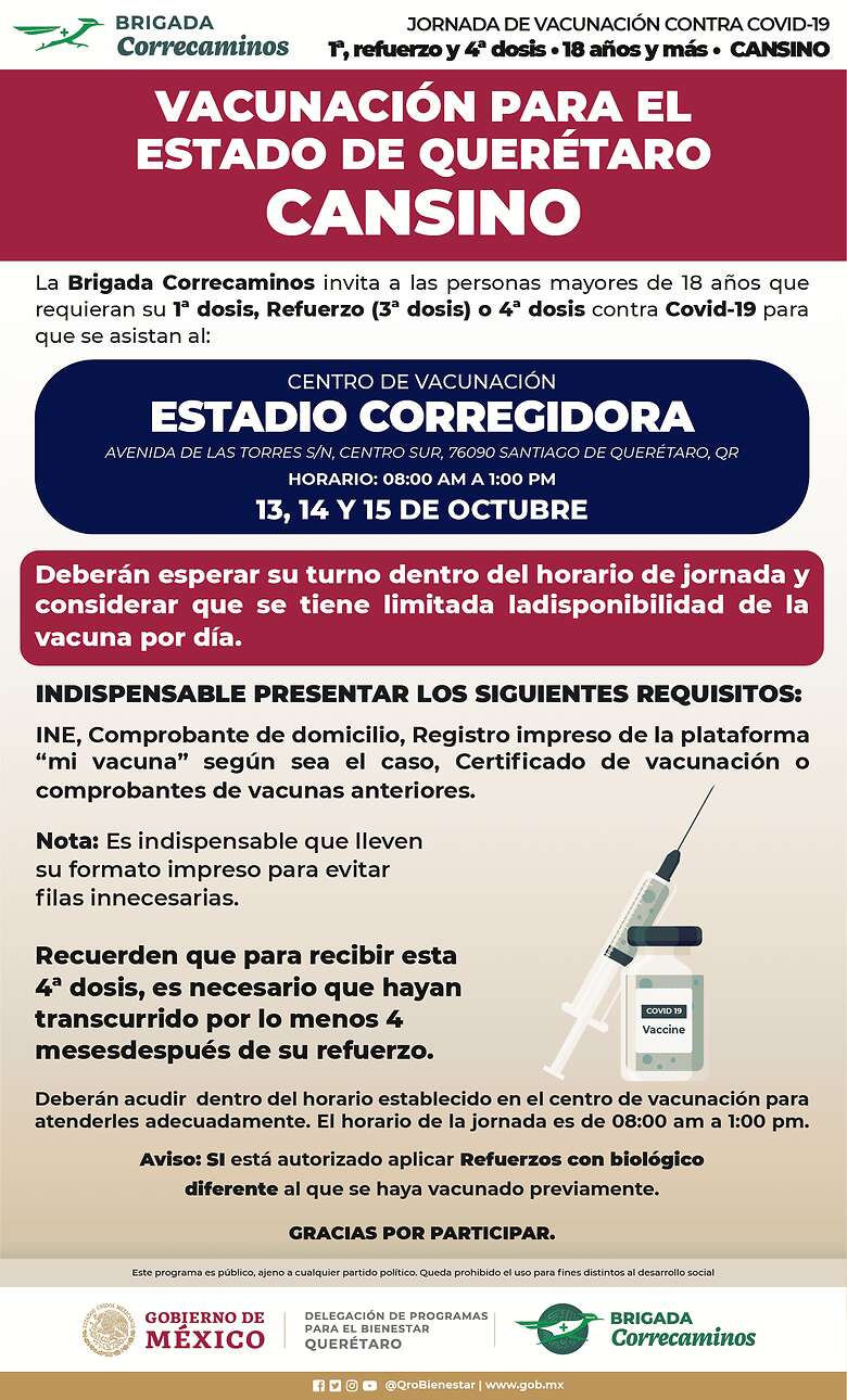 la vacunación se llevará a cabo en el Estadio Corregidora los días 13, 14 y 15 de octubre en horario de 8:00 a 13:00 horas.