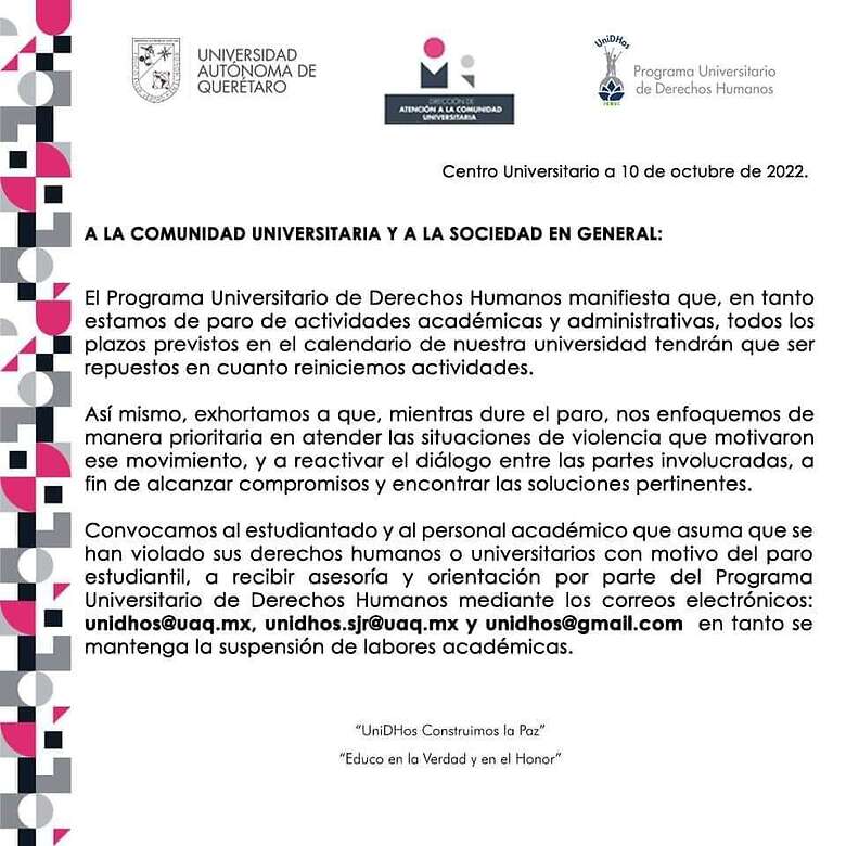 El Programa Universitario de Derechos Humanos de la UAQ emitió un comunicado en el que pidió centrar la atención en resolver las situaciones de violencia que motivaron el paro estudiantil