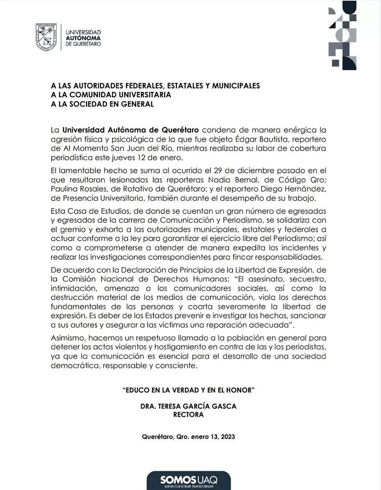 A través de un comunicado, que firmó la rectora de la universidad, Teresa García Gasca, la UAQ señala que este lamentable hecho se suma a las agresiones que sufrieron las reporteras Nadia Bernal y Paulina Rosales, así como el reportero Diego Hernández, el pasado 29 de diciembre, mientras realizaban su trabajo.