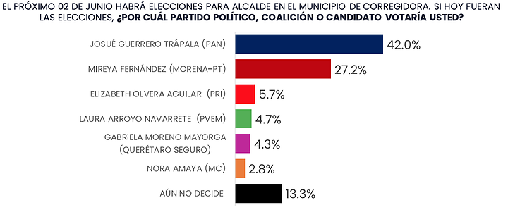 Mireya Fernández, candidata de Morena y PT, con 27.2 por ciento; la candidata del PRI, Elizabeth Olvera, obtuvo 5.7 por ciento; Laura Arroyo, candidata del PVEM, 4.7 por ciento; Gabriela Moreno, de Querétaro Seguro, 4.3 por ciento; finalmente, Nora Maya, de Movimiento Ciudadano, 2.8 por ciento; mientras que el 13.3 por ciento de los encuestados expresaron que aún no definen a quién darán su voto.