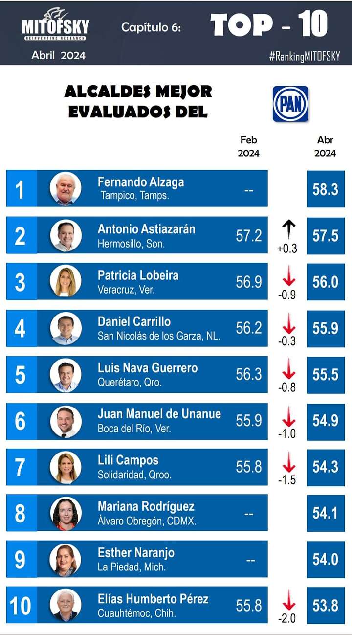 De los diez alcaldes con mayor aprobación ciudadana, seis son del PAN, tres de Morena y uno del PRI.