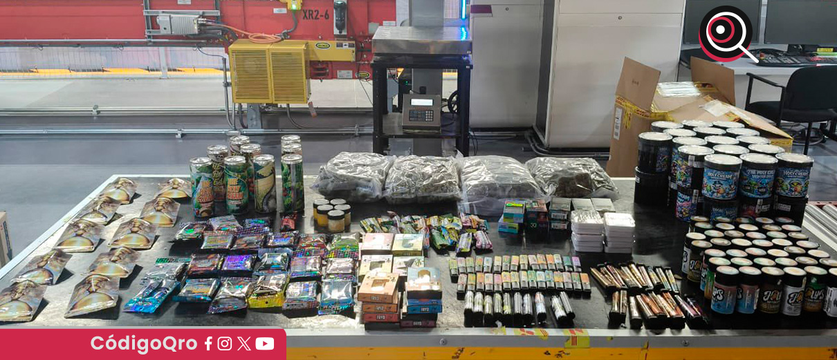 Elementos de la Guardia Nacional decomisaron 32 kilogramos de dosis de aparente marihuana, dosis de cannabis, cigarros electrónicos y diversos productos alimenticios elaborados con cannabis.