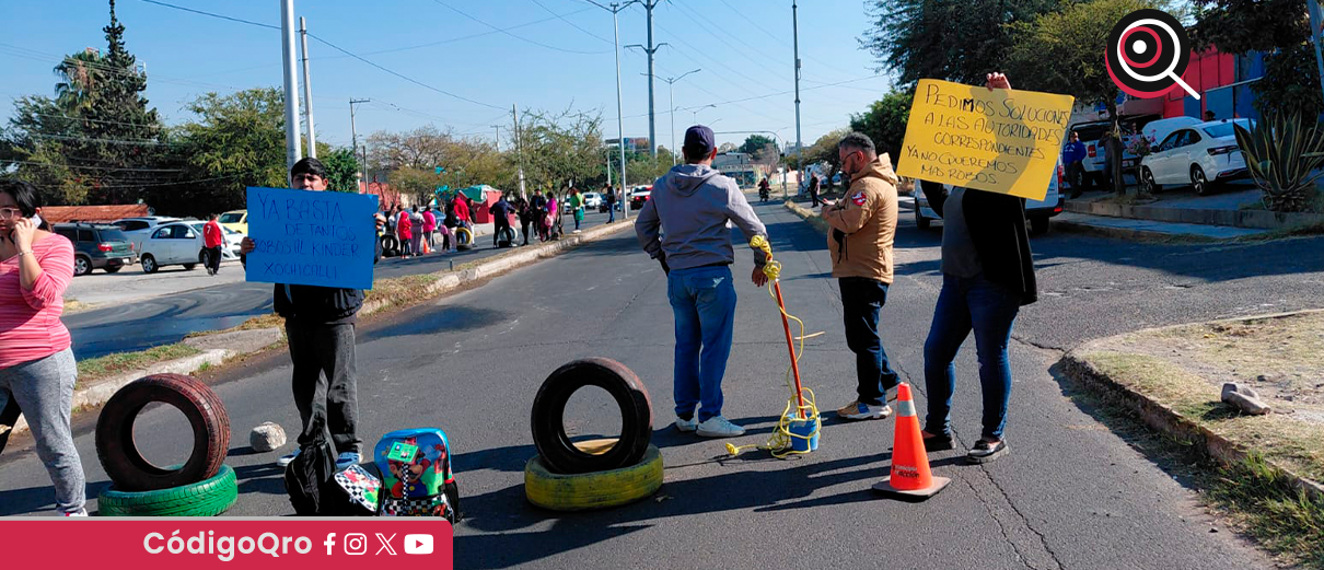 Padres de familia del preescolar Xochicalli, que se encuentra en la colonia Lomas de Casa Blanca de la ciudad de Querétaro, bloquearon la circulación vehicular de la calle 4 y se manifestaron por el robo e incendio que se registró este fin de semana al interior de la escuela.