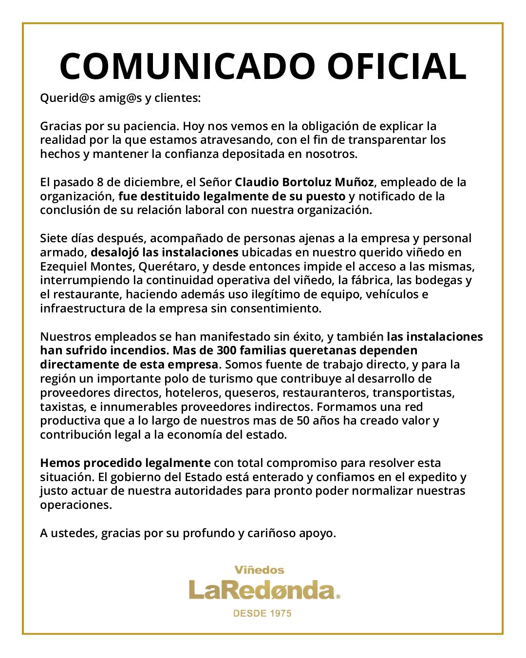 A través de un comunicado publicado en Facebook, la empresa expuso que el pasado 8 de diciembre Claudio Bortoluz Muñoz fue separado de su cargo, pero días después habría regresado al viñedo acompañado de personas ajenas a Viñedos La Redonda y presuntamente armadas, con quienes desalojó las instalaciones y bloqueó los accesos, impidiendo el funcionamiento del lugar.