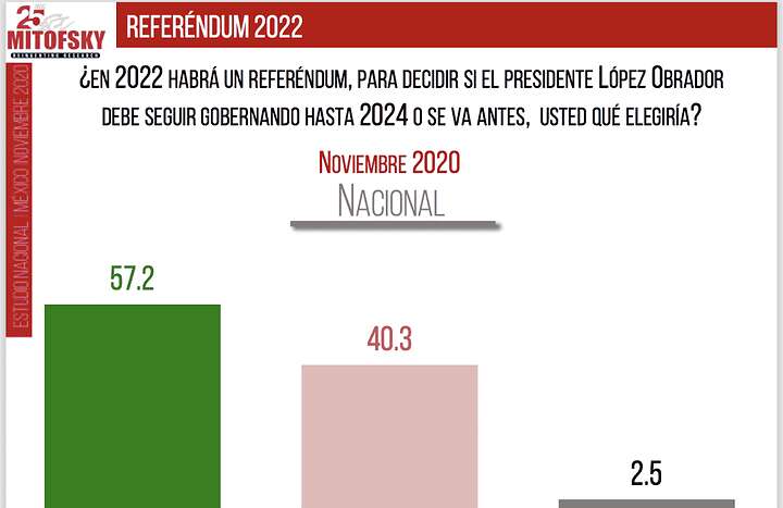 los mexicanos está a favor de que López Obrador concluya su mandato constitucional, y 40.3% quiere que se vaya dentro de dos años.