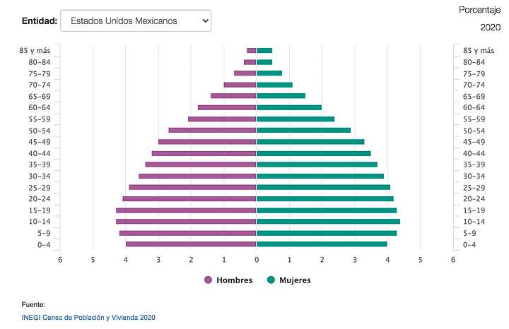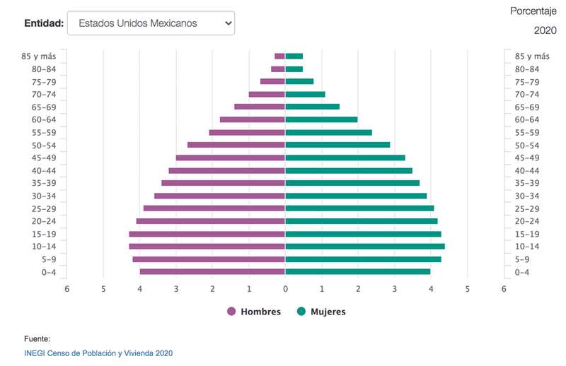 De acuerdo con el Censo de Población y Vivienda 2020, del INEGI, el grupo de población más grande es el de los adolescentes y jóvenes de 10 a 19 años, con 21 millones 750 mil 230; mientras que el grupo de población más bajo se encuentra en el rango de 64 años o más