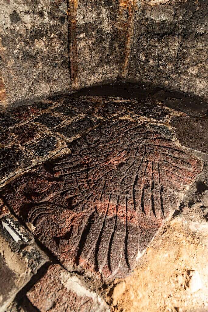 El bajorrelieve de un águila real descubierto recientemente, se ubicó al pie del Templo Mayor, en el eje central de la ‘capilla’ dedicada a Huitzilopochtli; correspondería al gobierno de Motecuhzoma Ilhuicamina (1440-1469 d.C.)
