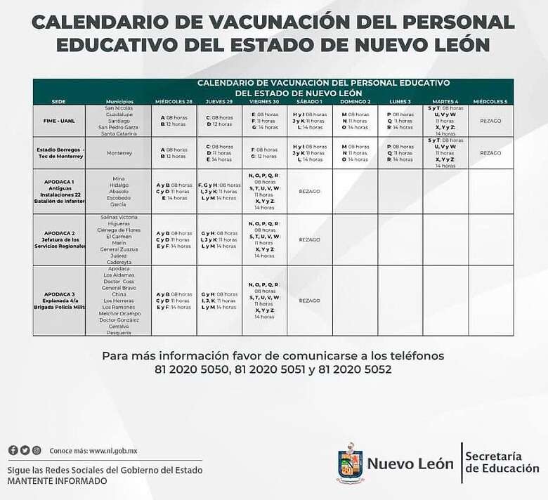 “se convoca al personal educativo de Nuevo León a acudir a las sedes de vacunación en un horario de 08:00 a 18:00 horas, de acuerdo a la inicial de su primer apellido y a la ubicación de su residencia, conforme al Calendario".