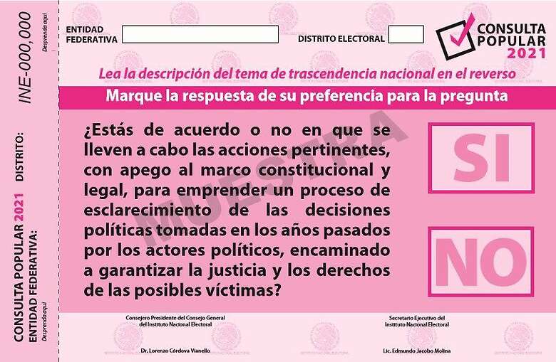 La boleta para el primer ejercicio de consulta popular en México, presenta la leyenda: