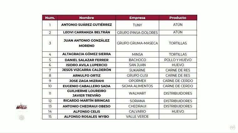 El secretario de Hacienda, Rogelio Ramírez de la O, y el presidente López Obrador presentaron el plan remozado que incluye a las empresas productoras de atún Tuny y Dolores, de harina de maíz Gruma y Minsa, así como Bachoco y San Juan, que producen pollo y huevo.