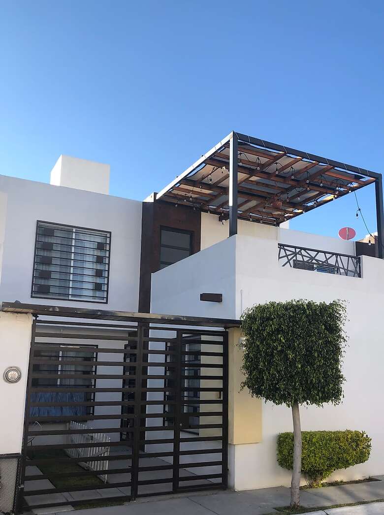 bonita casa en San Juan del Río. Este alojamiento esa de dos plantas y está en un fraccionamiento cerrado, a faldas del cerro gordo; cuenta con cocina, futbolito, un pequeño jardín trasero y “casa de árbol”.