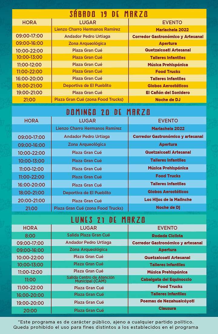 Aunado a ello, a partir del 19 de marzo, en la Plazuela Gran Cue estará instalado el “Quetzalcóatl Artesanal”, el cual consiste en la instalación de stands con temática de “La Serpiente Emplumada”, en donde las personas podrán conocer y adquirir artesanías de la región.