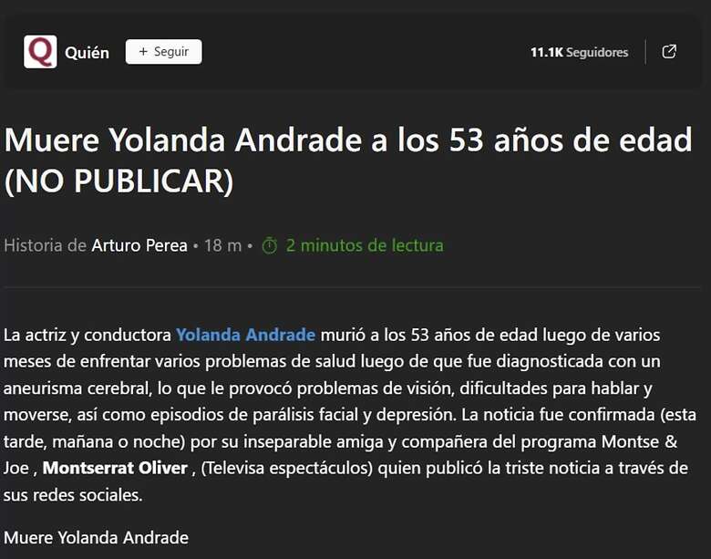 “La actriz y conductora Yolanda Andrade murió a los 53 años, luego de varios meses de enfrentar diversos problemas tras ser diagnosticada con un aneurisma cerebral, lo que le provocó problemas de visión, dificultades para hablar y moverse, así como episodios de parálisis facial y depresión”, se puede leer en la nota.